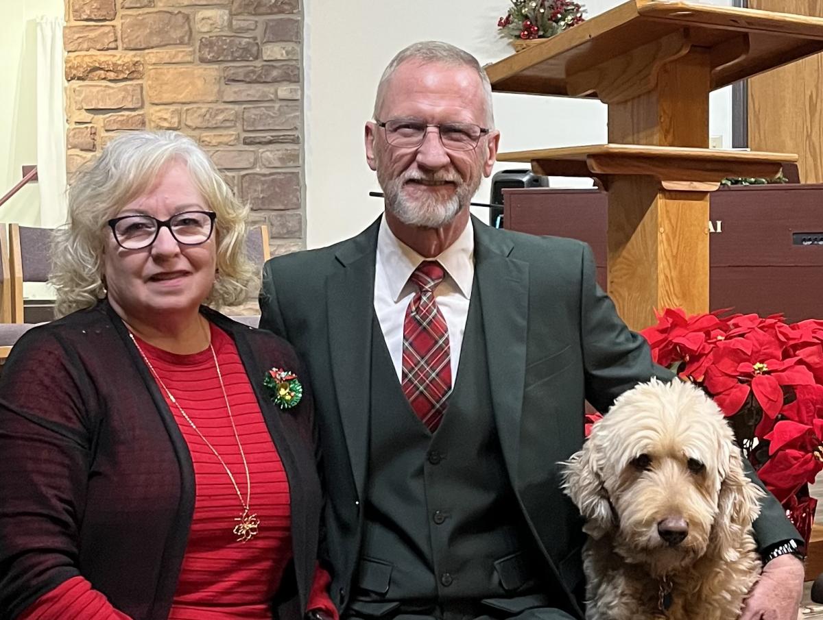 Pastor Steve and Cindy Hays, and Bella the service dog